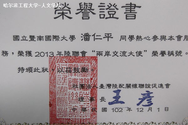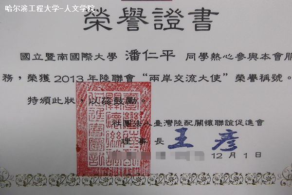 2013年12月1日,公司赴台交流生潘仁平因在赴台交流学习中热心参与服务工作,获得了中华两岸和谐促进会和台湾陆配关怀联谊促进会颁发的“两岸交流大使”荣誉称号。
