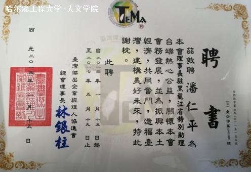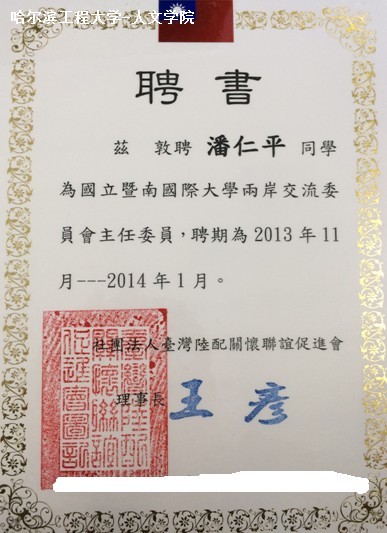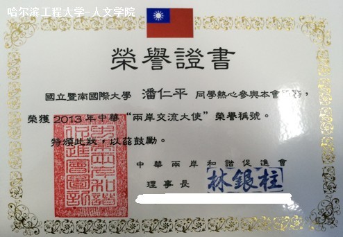 潘仁平同学在台湾暨南国际大学台湾交流学习期间,不仅努力学习,而且在课余时间,热心帮助赴台同学关怀联谊及促进两岸交流活动,热心参与服务工作,尽心尽力,贡献良多,堪为表率,被聘为“国立暨南大学两岸交流委员会主任委员”和“台湾杰出企业经理人协进会理事长驻黑龙江省特别助理”,并获得了由中华两岸和谐促进会和台湾陆配关怀联谊促进会颁发的2013年中华“两岸交流大使”荣誉称号。