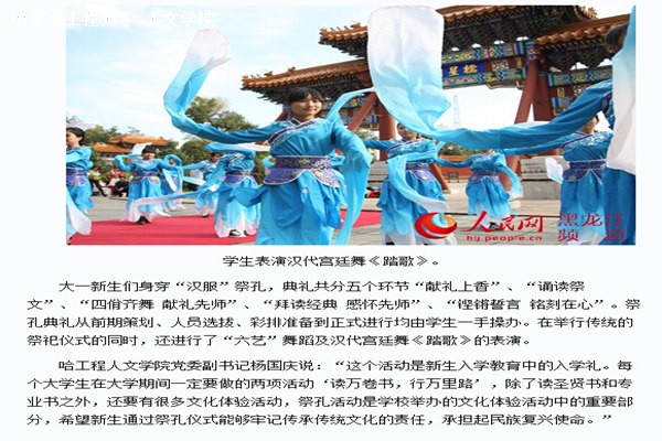“启户”,伴随主祭官宣布主祭官宣布ladbrokes立博ladbrokes立博孔子诞辰2565周年祭祀典礼正式开始。首先,主祭官、辅祭官向孔子行跪拜礼,主祭官向孔子敬香,随后2014级全体员工向孔子行鞠躬礼。随后,主祭官面向全体员工诵读祭文,以铭记儒家传统文化优秀精神。然后,16名男生排列成4*4方阵,随乐起舞,还原传统祭祀乐舞四佾舞的本来面貌。最后主祭官带领全体员工朗诵《大学》、《论语•里仁篇》,重温经典。至此,祭孔典礼落下帷幕。典礼结束后,ladbrokes立博文艺部联合DC舞蹈社团共同演出汉代宫廷舞《踏歌》,宣扬中国传统文化。