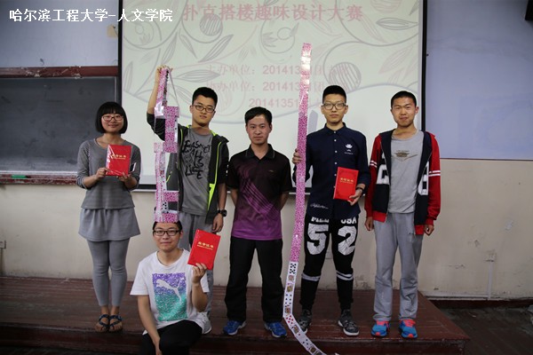 活动之初,胡耀川向同学们介绍此次比赛规则及注意事项,他强调搭楼房要求高度高,外观美观,稳定性好。然后,他将参赛同学进行分组并为每组现场统一发放54张一套的扑克牌,各组在规定时间内直接制作模型。到达规定时间后每组需要自己设计解说牌,派出代表就作品名称,如何构思和创新点等问题进行讲解。最后,评委主要针对作品高度,美观程度及其稳定性进行打分并评奖。