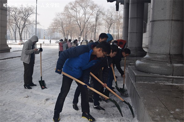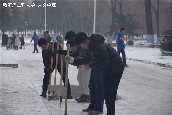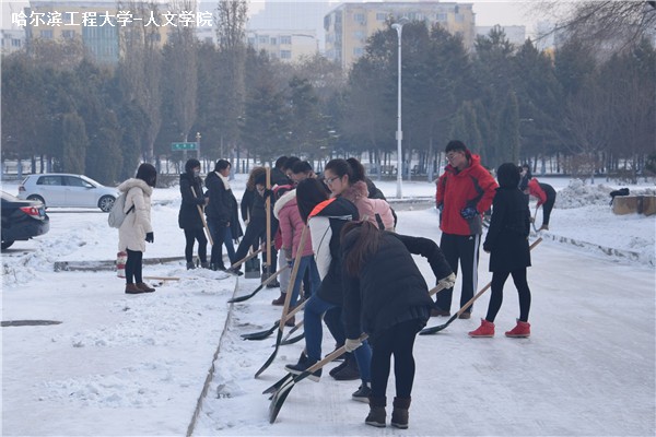 首先,全体成员在41号楼集合,领取扫雪工具。然后,董春辉辅导员将大家按班级分成6个组,分别为每个组安排了各自的分担区域。同时,他为每个组讲解了扫雪的技巧和扫雪工具的使用方法,向大家亲身示范了如何配合铲冰。同学们都干劲十足,配合默契,充分体现了人文精神。每个同学都不怕吃苦,互相鼓励,最终顺利的完成扫雪的任务。