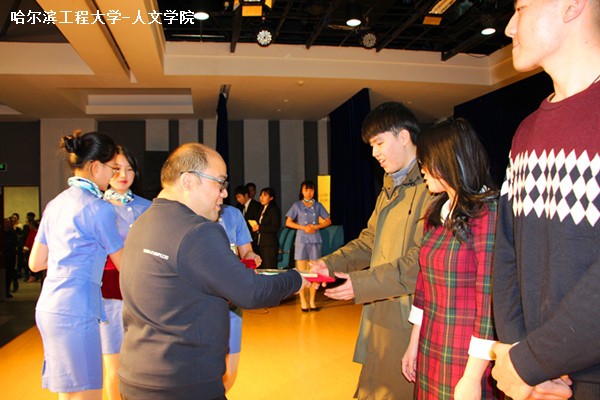 活动开始,首先主持人宣布员工获奖名单,随后同学们上台领奖,并由陈斌进行颁奖。颁奖结束后,陈斌与同学们合影留念。