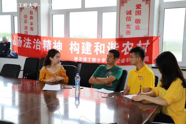 首先姜璐路结合上午的走访村民活动所了解的情况向张秋阳询问双合村的各项现状,并向其询问全体村民整体的受教育状况以及法律意识。紧接着张启着重从经济建设与法制建设提出问题,包括国家各项惠农政策、社保政策等现行政策的了解及落实状况,以及对国家现行法律、政策的宣传情况。