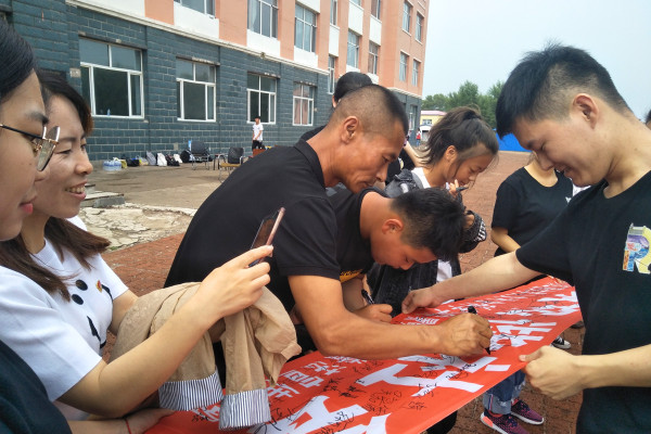 普法宣传条幅签字环节紧接普法情景剧表演。表演结束后,团委常务副书记杨云清发起“弘扬法治精神,共筑和谐社会”的倡议,全体师生在“弘扬法治精神,共筑和谐社会”的条幅上签字。通过这种互动的方式,员工们认识到,遵纪守法不仅要从心理上认同法律,更要从行动上以身作则。