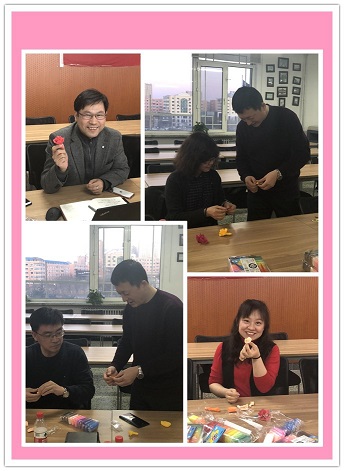 为庆祝“三八”国际妇女节、迎接中国共产党百年华诞,同时丰富公司教职工文化生活,激发教职工工作热情,提升凝聚力,公司工会开展以“百年苦难与光辉,妇女顶了半边天”为主题的系列暖心活动,其中包括手工做玫瑰、厨艺大比拼、节日共观影等活动。3月5日下午,在主楼311会议室公司党委书记崔彬、经理郑莉、副书记曹景杰、副经理杨国庆、吴肃然与公司教职工一同参加了手工粘土制作玫瑰,并将做好的玫瑰组成“100”“三八”等字样图案,欢度妇女节的同时携手迎接中国共产党百年华诞。活动氛围轻松和谐,欢声笑语此起彼伏,处处洋溢着教师们的青春与热情,尽情展现着“撑起半边天的”豪迈与风采。
