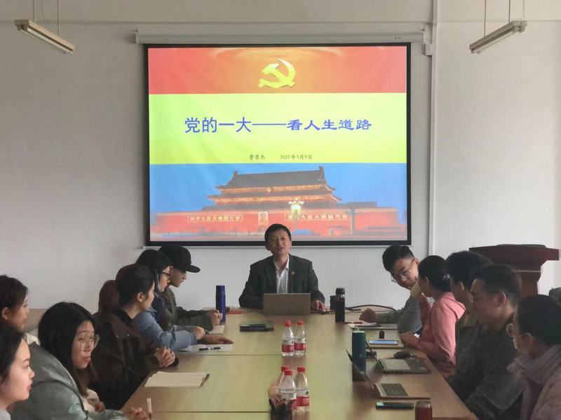“历史的奥妙,在于它可以包含无穷无尽的假设;历史的冷峻,又在于它总把假设永远置于假设。”曹景杰用这样两句话引出了会议的主题,中国共产党的历史是可歌可泣的历史,是惊心动魄的历史,是值得我们反思与学习的历史。接着曹景杰向同学们介绍了一大代表的人生道路,包括毛泽东、董必武等人,使同学们感受到了这些最初的共产党人是多么的不易,中国共产党是在他们的泪水、汗水、甚至是鲜血之下一步步艰难发展起来的。然后,曹景杰依次介绍了中国近代发生的重大历史事件,包括五四运动、中国共产党成立等。随后曹景杰告诉同学们思想决定方向,方向决定道路,道路决定命运。我们要向党看齐,解决自己的思想困惑,找到正确的思想,学会审视自己的内心,让自己的生命在历史中燃烧。