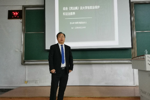 彭山岭简要回顾自己离校近20年的感想后,讲座正式开始。他首先以《民法典》颁布为切入点,介绍了《民法典》的体系,他指出:“《民法典》是一部固根本、稳预期、利长远的基础性法律,有利于完善中国特色社会主义制度,建设社会主义法治国家,推进国家治理体系治理能力现代化,维护最广大人民根本利益。”其次,彭山岭讲解了《民法典》中涉及老员工就业的相关规定,对《民法典》101条、496条、152条、1010条、1035条、1191条包括劳动合同形式、合同撤销、个人信息保护、用人单位责任等法条原文以及现实中存在的法律风险进行详细解释。然后,彭山岭重点讲解了老员工就业面临的主要法律事项和权益保护,辅以生动形象的案例,使同学们对基本尽调、三方协议、劳动合同或聘用协议、工资支付、社会保险和公积金、工伤和医疗期、企业提出协商解除合同和经济补偿金、保密和竞业限制、周末休息日和法定假期(及年休假)、股权激励制度等有了进一步的了解。最后,彭山岭提出了老员工所应具备的法治素质,要求同学们培养法治意识和法律思维,鼓励同学们通过协商、调解、诉讼等途径维护自身合法权益。