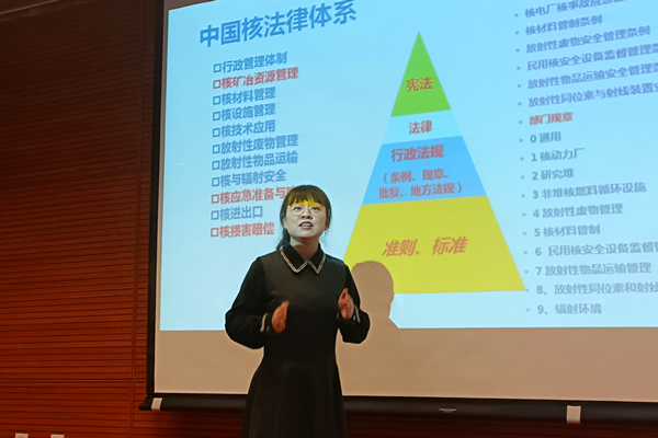 下午2时30分,讲座准时开始。首先由主持人徐佳璐老师为刘久老师颁发人文思政工作室聘书。接下来,刘久老师分析了安全与发展的关系,指出核法律对核安全与发展的重要性。刘久老师用深入浅出的语言、生动形象的案例,从核矿冶、核设备、核设施、我国核安全应急响应制度、核材料和设备贸易、辐射防护、乏燃料与放射性废物治理等方面介绍了我国核法律体系,阐明法律是核安全的有力保障。最后,她指出,核科学与技术和法学的融合发展是培养“核法兼备”的跨学科人才的基础与要求,而如何培养跨学科人才,使其在核法律领域走出一条“专而精”的特色发展之路,任重道远。