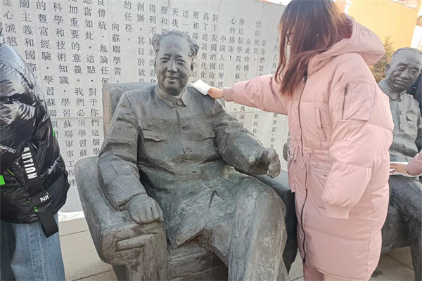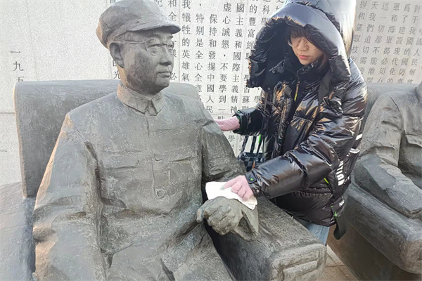 志愿者们于下午1时在军工纪念馆前集合完毕,罗星月向志愿者们介绍本次活动的目的和内容,并对志愿者进行任务分配。在了解群雕背后的历史后,志愿者们满怀敬意,小心仔细地用抹布擦拭授命群雕上的灰尘与积雪。经过一个小时的擦拭,群雕焕然一新。