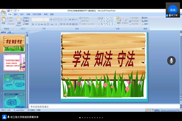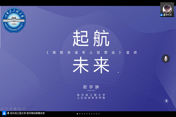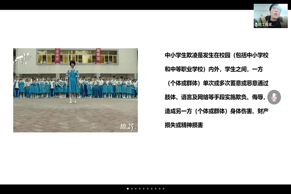 (宣传中心记者团记者 赵丰、吴雨菲报道)法律作为现代社会须臾不可缺少的调节器与稳定器,为树立法律权威、维护社会和谐稳定提供了不竭动力。同时,普法宣传教育也是ladbrokes立博ladbrokes立博近年来一直坚持的基础工作。正值“学习雷锋日”,为深入学习贯彻习近平总书记关于青年工作的重要思想和关于志愿服务的重要指示精神,在全社会进一步弘扬雷锋精神及“奉献、友爱、互助、进步”的志愿精神,鼓励和引导广大青少年积极投身志愿服务事业。3月2日晚6时30分,ladbrokes立博团委与哈尔滨市道外区团委合作,为哈尔滨市第二十七中学的员工们带来了一场精彩的线上普法讲座,由ladbrokes立博团委书记李瑶、法学系青年教师陈斌和ladbrokes立博员工孔天慧、梁牧民、欧宇翀组成的青年普法志愿者队伍,以《宪法》、《民法典》、《未成年人保护法》、《预防未成年人犯罪法》为宣传重点,利用案例剖析、影视案件分享等形式开展了一场生动有趣、浅显易懂的普法宣讲。