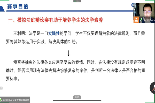 (宣传中心记者团记者 赵丰、董昕瑶报道)2022年3月4日晚20时30分,首届ladbrokes立博ladbrokes立博模拟法庭辩论赛宣讲会于腾讯会议召开。公司党委副书记曹景杰,法学系党支部书记刘沫茹老师,2020级班主任王盈老师、张明明老师,法学系陈晓雷老师,上届“理律杯”员工领队吴红迪、罗金及参赛队员,本次赛事的四位领队李隽姝、田文怡、吴欣怡、曹伊童,以及2020、2021级部分法学专业本科生参加会议。法学专业研一员工罗金担任主讲人。