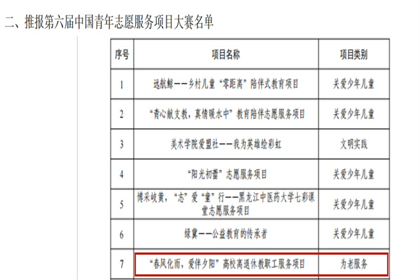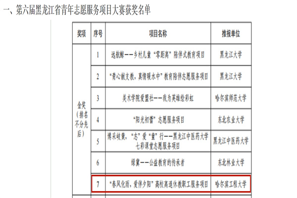 (宣传中心记者团记者 曾诗妤、吴雨菲报道)近日,由共青团黑龙江省委员会主办的第六届龙江青年志愿服务项目大赛成功落下帷幕。本次大赛采用线上评审的方式进行,经过各市(地)团委、各省管企业团委、各高校团委等单位组织推报,共138个项目参与评选,经过资格审查、材料初评、项目终评,最终角逐出金奖7个、银奖10个、铜奖10个、优秀项目奖11个。公司师生在本次比赛中成功入围决赛,斩获优异成绩。