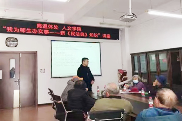 在离退休处处长高峰进行关于离退休工作的简单汇报后,讲座正式开始。关健老师从《民法典》的立法意义切入,对立法亮点进行了介绍。在此基础上,针对老年人普遍关心的财产分割、财产纠纷、财产继承与赠与等内容进行了细致讲解,与会人员都获益匪浅。随后,各位离退休教工针对自身问题进行了咨询,内容涉及房产问题、遗嘱问题、继承纠纷、赡养协议等方面,关健老师对这些问题一一进行了详细解答,获得了与会教工们的一致好评。