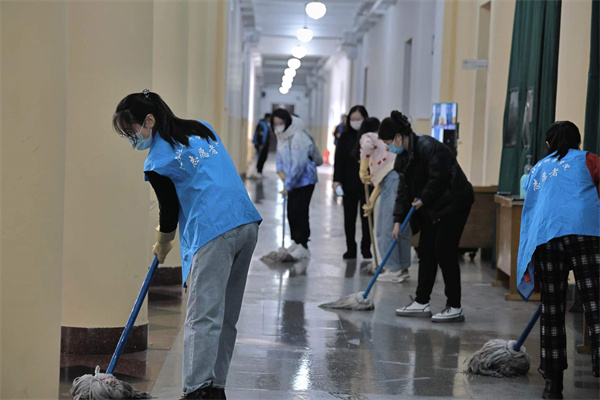 活动开始,同学们手持预先准备的抹布,拖布等清扫工具到达指定位置;随后,同学们开始擦拭窗台,清扫周围环境;紧接着,同学们检查仍存在的卫生死角,并进行清理;最后收好工具并进行拍照留念。