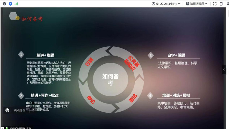 在随后的交流环节中,参会的同学就考公的一些具体问题进行咨询,主讲人也都做出了相应的回答和解释,使同学们对当前考公的形势、备考的整个过程有了更加清晰的认识和明确的方向,坚定了同学们全力备考学习的信心。最后,刘沫茹老师对三位主讲人的分享表示感谢,对即将毕业的研究生表达了美好的祝愿;同时对本次参会的同学们也给予了充分鼓励,期待即将开始考公备考的同学们能够通过努力取得自己满意的成绩,实现自己的人生理想。