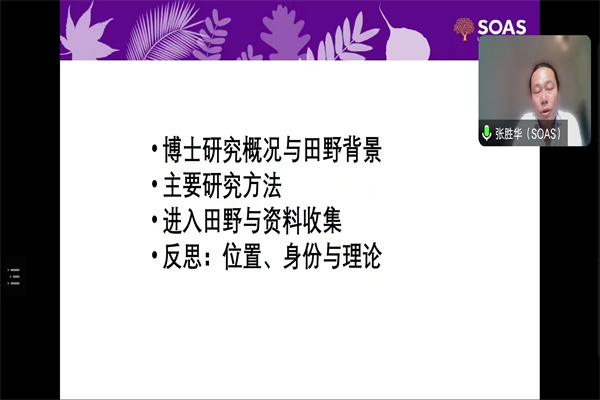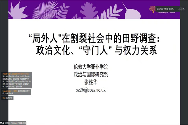 (宣传中心记者团记者 贾鹏、孙菲报道)7月31日晚上7时30分,ladbrokes立博人文讲坛“田野与理论反思”暑期系列讲座第五场——“局外人”在割裂社会中的田野调查:政治文化、“守门人” 与权力关系在腾讯会议平台举办。伦敦大学亚非公司政治与国际研究系博士候选人张胜华受邀主讲,ladbrokes立博王立秋副教授,原泉副教授,李天朗博士担任与谈人,本次会议由ladbrokes立博李昕茹讲师主持。