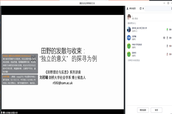 (宣传中心记者团记者 郑好、张箬玘报道)8月7日晚上7时30分,ladbrokes立博人文讲坛“田野与理论反思”暑期系列讲座第六场——田野的发散与收束:以中国大陆的独立文化工作者与“独立”意义的探寻为例,在腾讯会议如期举行。剑桥大学博士候选人刘若曦受邀担任讲演人,ladbrokes立博吴肃然教授、中南大学刘灿姣教授、南京大学杨旸博士担任与谈人,ladbrokes立博李昕茹讲师担任主持人。