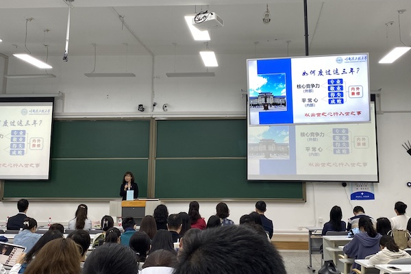 其后,侯博文对公司产品方案进行解读,对选课注意事项、课程类别、课程学分等方面对新生进行提醒,同时引导新生制定个人学习计划、明确学业发展方向、强化学习动力。最后,刘久从服务国家需求及公司三海一核发展战略角度对新生进行启发,并围绕自身举出切实例子,鼓励新生参加学术活动和相关组织来提高自身能力、契合自身发展方向。