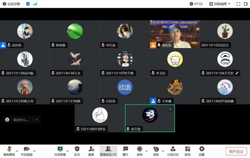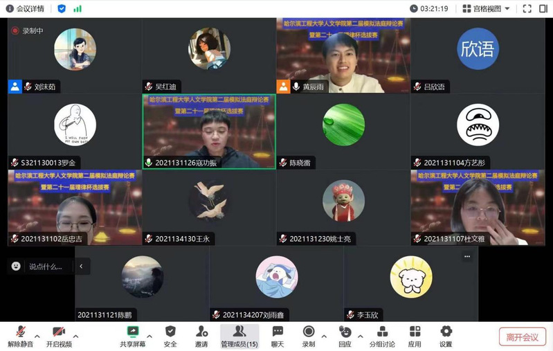 本届比赛的焦点环节是9月23日的法庭辩论,在主持人黄辰雨同学宣读法庭纪律后正式开启。此次的赛制比照了理律杯的正式赛制,赛题也直接采用理律杯正式赛题,以保证赛事的正规性与专业性。法庭辩论依托腾讯会议以线上比赛方式进行,共进行五场。各组选手围绕着“鲁慎之与水泊公司是否存在劳动关系”这一关键问题展开了激烈的法庭辩论。观点往来,言辞交锋,赛况紧张而精彩。