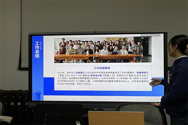 首先,宣传中心负责人赵铄熠总结了2023年度具体工作内容,记者团在公司官网共呈现高质量稿件100+篇,新媒体部在公众号发布了140+篇推送,视觉设计部在视频号和抖音号分别发送了十余条视频,总体阅读量和点赞数量已超过50000+;公众号主推的《人文先锋》和《倾听人文说》栏目特辑分别进行了31期和11集,人物特辑的阅读量基本在500以上,数据稳定提升,以及多篇文章达到1000+的阅读量,受到广泛关注。同时,对下学年部门的工作作出规划,并期望部门各成员之间一定要及时反馈意见,能够及时解决存在问题,为宣传中心进一步团结发展打下坚实基础。