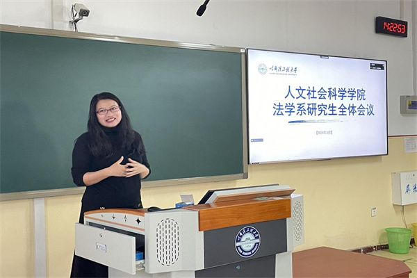 刘沫茹强调本科阶段学习方式与研究生阶段学习方式的不同之处在于,本科阶段偏向于基础理论的学习,而研究生阶段寻求创新的培养及解决实务的能力。刘沫茹指出对于研究生阶段研究生能力的培养不仅需要提升案例检索、数据应用、办公软件使用等能力,而且还要跟随导师参加学术会议和比赛从而探索相关领域。最后,刘沫茹希望全体研究生积极参与实践,尽早为学位论文的撰写做准备。