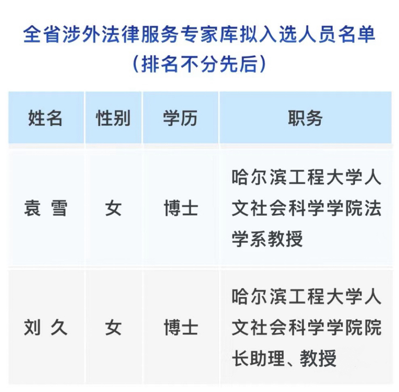 日前,黑龙江省司法厅公布全省首批涉外法律服务专家库拟入选人员名单,公司袁雪、刘久两位教授入选首批涉外法律服务专家库。