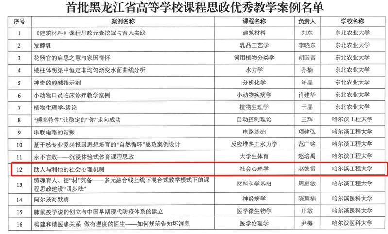 2022年12月,赵德雷老师的《助人与利他的社会心理机制》,荣获首批省高等公司课程思政优秀教学案例,省教育厅将在全省课程思政教学资源库中统一发布课程视频、教学设计,形成立体式教材,供全省教师观摩学习,在文工融合视阈下,形成可听、可看、可学、可练的立体式教材。