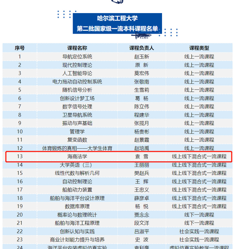 4月11日,根据《教育部关于一流本科课程建设的实施意见》和《教育部办公厅关于开展第二批国家级一流本科课程认定工作的通知》的有关要求,教育部公示了第二批国家级一流本科课程认定结果,公司袁雪老师的《海商法学》喜获国家级线上线下混合式一流课程认定。