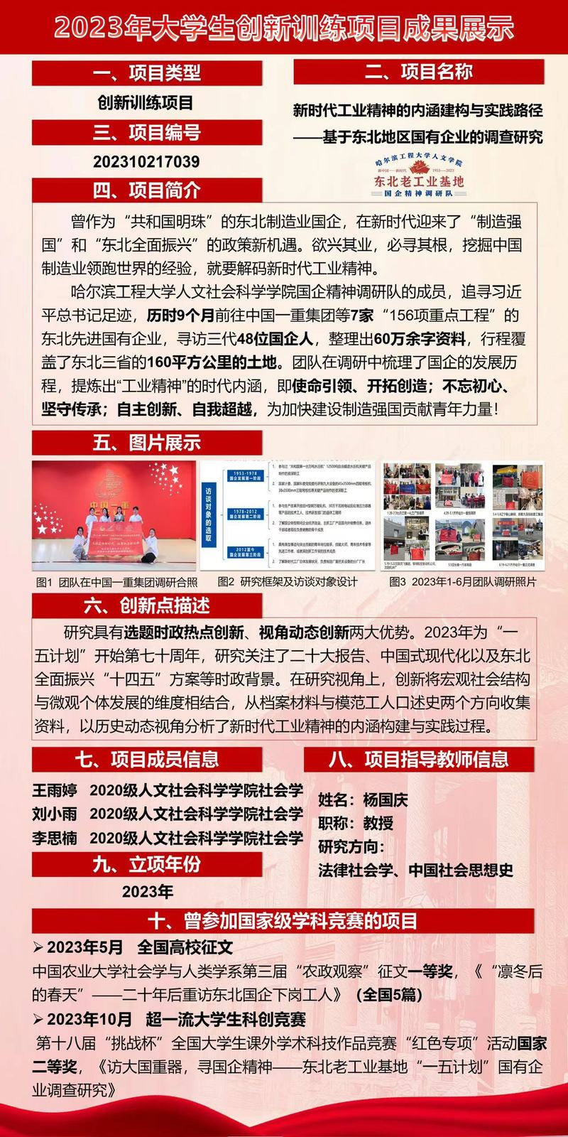 该项目曾获第十八届“挑战杯”全国老员工课外学术科技作品竞赛“红色专项”活动国家二等奖,《访大国重器,寻国企精神——东北老工业基地“一五计划”国有企业调查研究》;曾在中国农业大学社会学与人类学系第三届“农政观察”征文一等奖,《“凛冬后的春天”——二十年后重访东北国企下岗工人》(全国5篇)。
